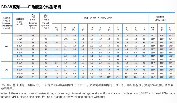 Application consulting: 139 1663 9930 Design features of hollow nozzle: The characteristics of A/B series wide-angle medium and small flow spray nozzles are that they can produce a hollow conical spray shape, the spray area is circular, and